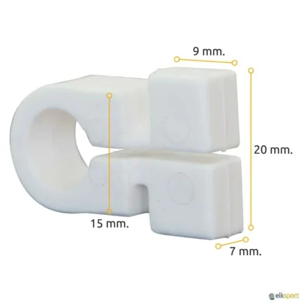 Ganchos fabricados com entrada dupla, com os quais se obtém uma perfeita fixação da rede. Para balizas com ranhura de 8 e 10mm. Para outros tipos de balizas pode ser aparafusado no poste. Inclui parafuso de fixação. As cores podem variar.