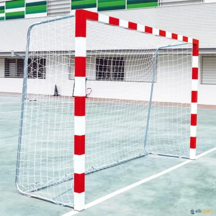 Baliza de andebol fabricada em perfil de ferro, de secção quadrada de 8 x 8 cm, lacada vermelho e branco. Em conformidade com a norma UNE-EN 749.