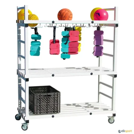 Carro para arrumação de halteres aquáticos, fabricado em tubo quadrado de PVC. Resistente à humidade, ácidos e gorduras. Com 4 rodas rotativas, 2 com travão. Dimensões: 140 x 40 x 125 cm. Entregue montado. Prazo de entrega: mínimo de 5 semanas.