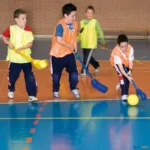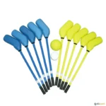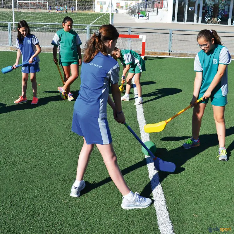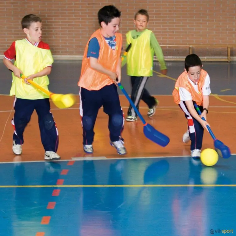 O jogo de hóquei super suave (SS) é composto por: 10 sticks SS (5 amarelos e 5 azuis), 1 bola de espuma e 1 disco de espuma.
