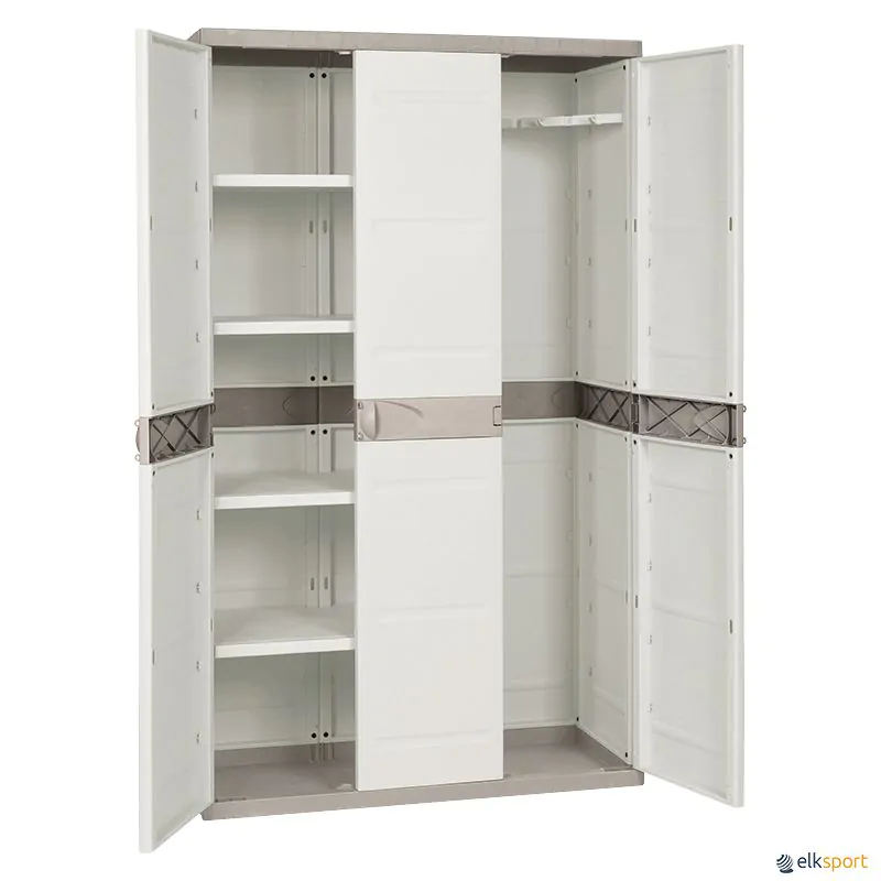 Armário fabricado em resinas plásticas de alta qualidade. Robusto e resistente a ambientes húmidos. De fácil montagem sem ferramentas. Possibilidade de fechar com aloquete (não incluído).