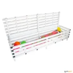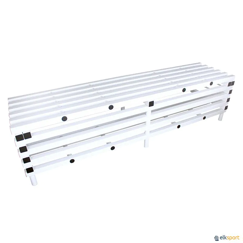 Banco fenólico com sapateira de 2 ripes e cabides. Material recomendado para balneários de piscina. Totalmente anti humidade, duradouro e robusto. Estrutura soldada em aço inoxidável tubo de 30 mm, pintado com epóxi. Taco em PVC. Variedade de cores disponíveis. Se não for especificado, será enviado na cor azul.