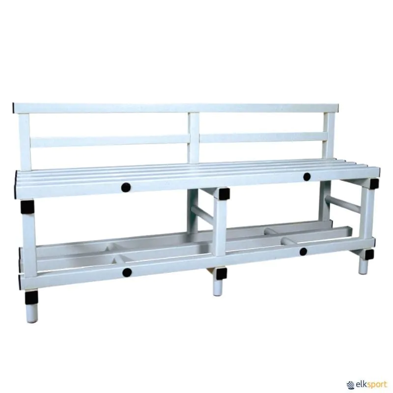 Bancos fabricados em resinas plásticas (material de grande resistência, até 400 kg/m) em tubos quadrados. Resistentes a temperaturas extremas, desde -40°C até +80°C, inalteráveis a ácidos, óleos, gorduras e humidade. Com superfície lisa e sem poros facilitando a limpeza. Material inoxidável. Arestas arredondadas para maior segurança. Com encosto e porta sapatos.