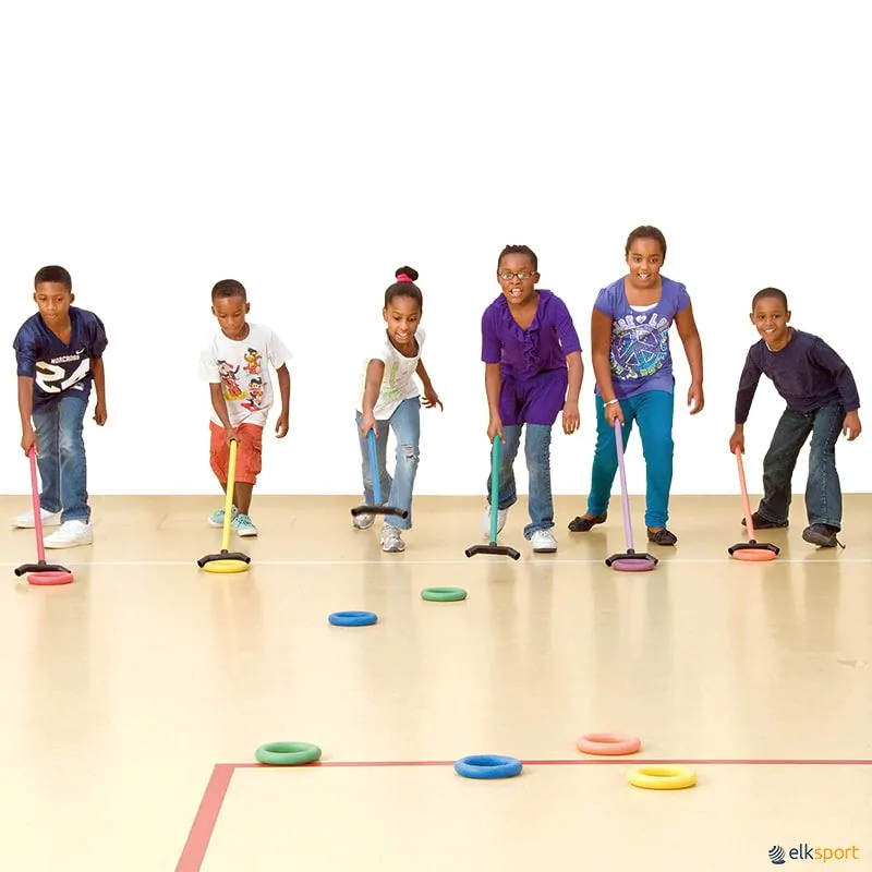 O conjunto de seis bastões de Shuffleboard com seis cores funciona bem com diferentes discos, aros ou pequenos anéis. Apontando para uma linha ou a uma zona, este é um jogo muito divertido tanto na sua fase de aprendizagem como para quem sabe jogar. É perfeito para funcionar como uma estação em diferentes atividades ou numa prova de estafetas.