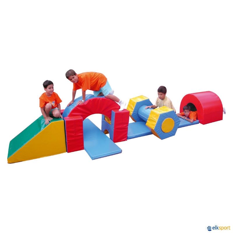 Formas geométricas de espuma revestidas de tela de PVC. Estão pensadas para poder encaixar umas nas outras e formar várias combinações.