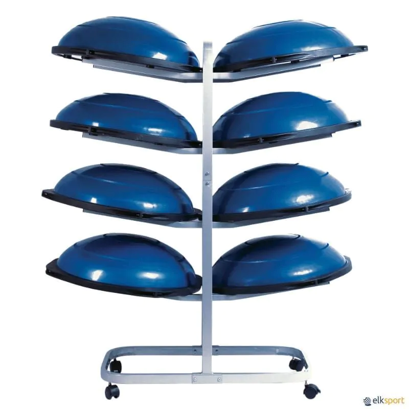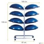 Estante metálica com capacidade para 8 semiesferas, com rodas para facilitar o transporte.