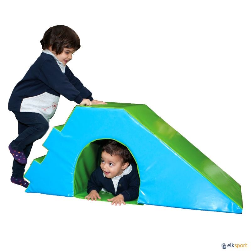 Rampa túnel em espuma forrada, para jogos de psicomotricidade. Pode ser usada com outras formas geométricas e formar diferentes combinações.
