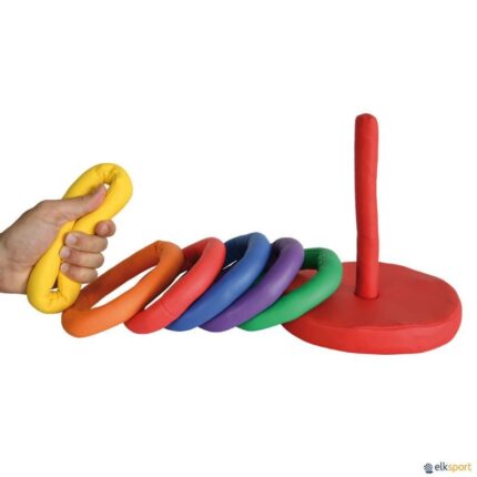 O jogo é composto de: 6 anéis em 3 cores, 5 mastros e 2 bases em cruz numeradas.