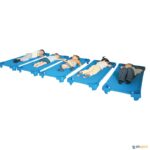 Disponível á parte lote 4 rodas para cama de creche, fáceis de colocar na estrutura da cama e permitir o seu transporte de forma mais cómoda e prática.