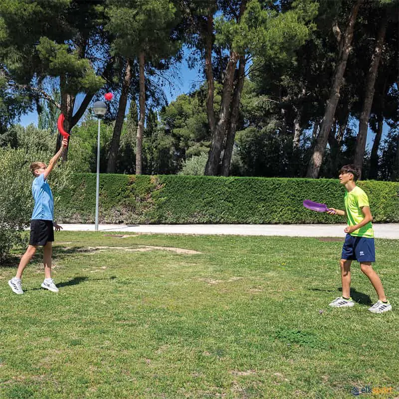Uma espécie de pelota basca. Ideal para desenvolver a coordenação óculo-manual, bem como a análise de trajetórias, distâncias e direções. Pode trabalhar-se de forma individual, a pares ou por equipas, com rede ou num espaço sem obstáculos, contra parede. É por isso muito versátil, permitindo um grande número de atividades.