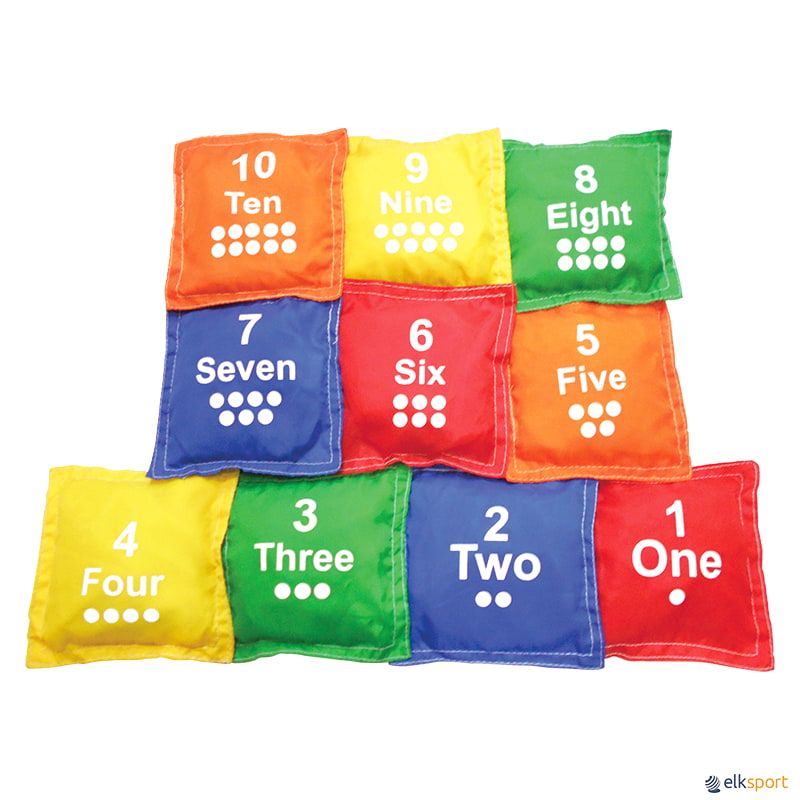 Sacos básicos numerados de 1 a 10, em inglês, pensados para trabalhar matemática e cálculo simples, aumentando as possibilidades de jogo. Fabricados em nylon com duplo revestimento, oferecem uma solução económica e segura.
